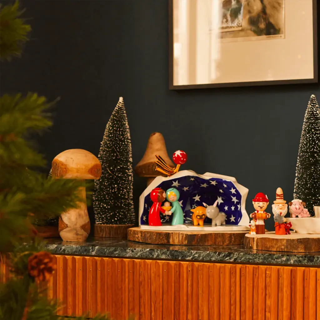 Résolument contemporaine tout en s’inscrivant dans la tradition, cette crèche se pose comme objet décoratif haut de gamme : un mélange d’artisanat (porcelaine peinte à la main) et de design ludique. Son format est d’environ largeur 27 cm, profondeur 14 cm, hauteur 20 cm.